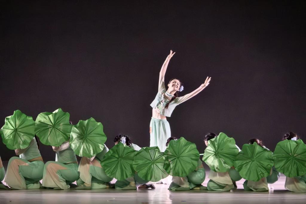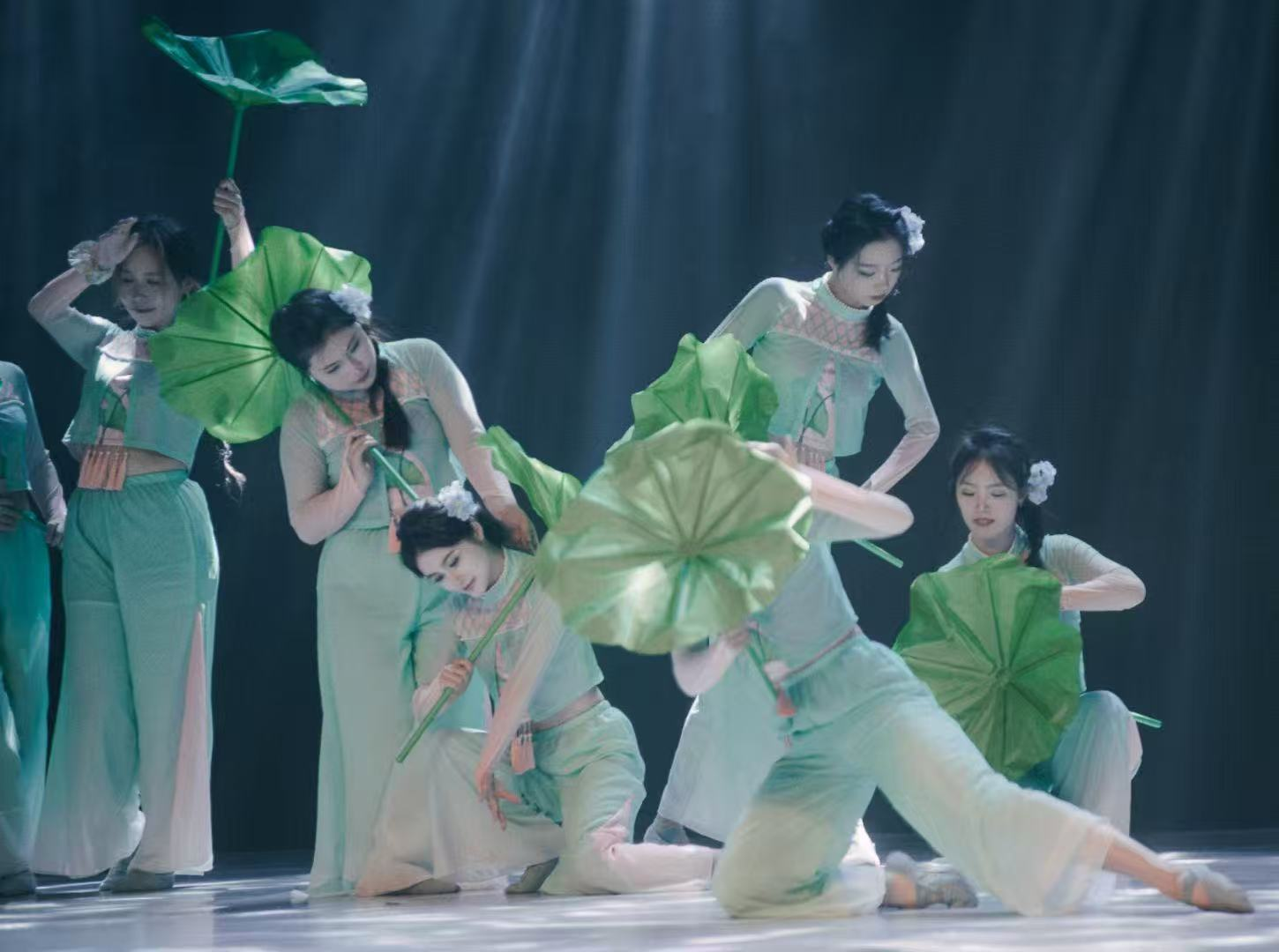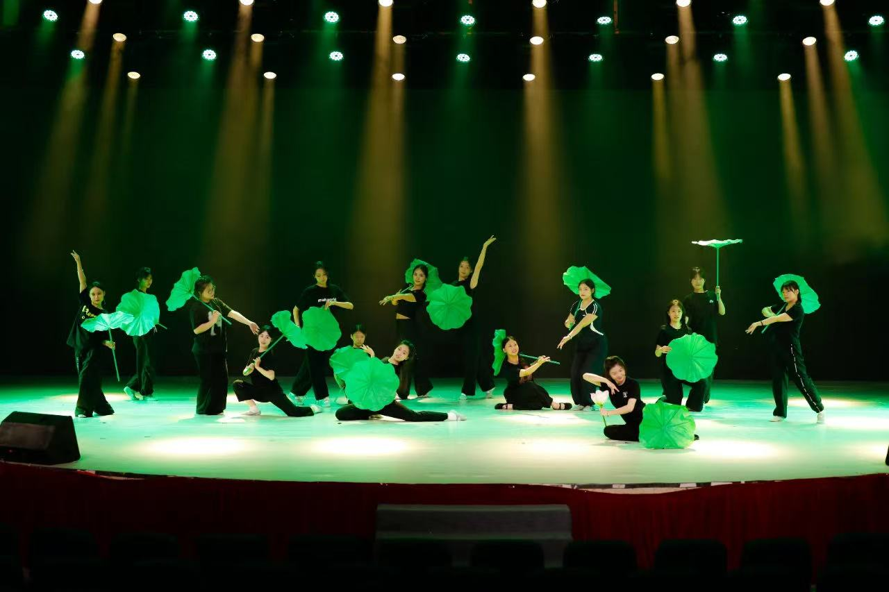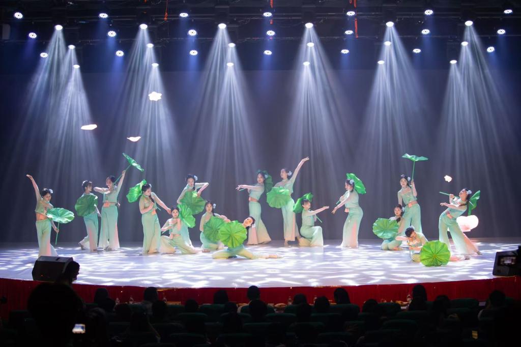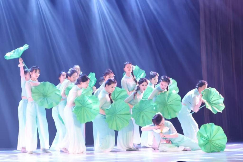 舞台上,舞者们身着渐变青莲色舞衣,手持莲叶道具,以行云流水般的动作勾勒出莲叶摇曳的唯美意境。作品巧妙实现了传统文化与现代审美的有机融合,通过细腻的动作设计、精准的队形变换以及富有张力的舞台表现,将“接天莲叶无穷碧”的诗意画卷徐徐展开。舞者们举手投足间展现的专业素养与艺术感染力,配合精心设计的灯光变换,赢得了现场评委和观众的一致赞誉。