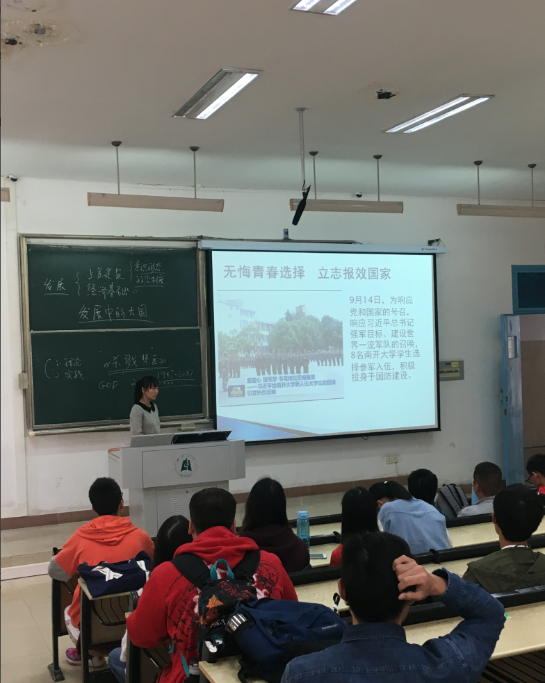 在16地理科学班级,伴随着团支书何新洁洪亮的声音诵读习近平总书记回信内容,同学们的热情也瞬间被点燃。习近平总书记给南开入伍老员工的回信,就像一支火把,在黑夜中照亮了广老员工前进的路途,使他们更加坚信未来会愈来愈美好。弘扬老员工参军入伍,就是对爱国主义情怀的进一步加深。