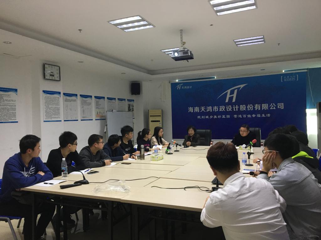 1月16日上午,海南天鸿市政设计股份有限公司柏斌董事长及公司相关部门主要负责人与天鸿班员工召开了见面会,会上柏斌董事长对公司师生一行表示热烈的欢迎,对公司高度重视本次教育实践活动表示感谢,同时对集团和公司师生对于天鸿公司的支持表示感谢。会上柏斌董事长耐心的聆听同学们的自我介绍,并跟同学们进行了深入的交流,他希望同学们珍惜这样的机会,在实践工作中,将理论与实践相结合,将公司文化和企业文化相结合,艰苦奋斗,脚踏实地,在工作中学习做人、做事,争取更好的成长,等毕业走向工作岗位,能充分发挥自身优势,迅速成长为公司发展的中坚力量。会上,卢进登老师代表师生一行对天鸿公司为本次员工实习做出的努力表示感谢,感谢天鸿公司为员工提供这样一线实践的宝贵机会,并对全体学员提出了三点具体要求,一是要高度重视本次实践经历,珍惜学习机会,端正学习态度,不要辜负公司和天鸿公司的努力付出;二是要常怀感恩之心,虚心学习,学习做人、学习做事。向身边优秀的同事、领导学习,同学们之间要互相学习、互相帮助、共同成长;三是多思考、多总结,每天实习工作中要多思考,尤其是一线工作过程中要做到不懂就问,每天实习结束要总结实习的感悟,本次实习结束之后高标准、高质量完成实习总结报告,下学期开学初将召开实习总结交流会。会后,卢进登老师与公司本次实习负责人共同商讨确定了本次实习的方案,王文锋老师还特别跟全体学员强调了本次实习的纪律,要求同学们实习期间一律集体活动,服从安排,统一行动,每晚班长查寝,向学院报告情况。