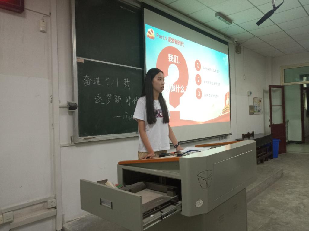 2017级环境科学与工程班以讲演历史的形式开展本次活动。团支书张博作为主讲人,带领同学们重点回顾了祖国母亲发展历程中的三个重大时间节点。一是新中国成立,二是开始改革开放和社会主义现代化建设的1978年,三是新时代的今天。筚路蓝缕的旅程中一项项巨大成就、一串串亮丽数字的背后,浸透的是中国人民风雨兼程的辛勤汗水,凝结的是人民对美好生活的追求与梦想。通过团支书的讲解,同学们对中国从站起来、富起来到强起来的光辉历程有了更深刻的体会。
