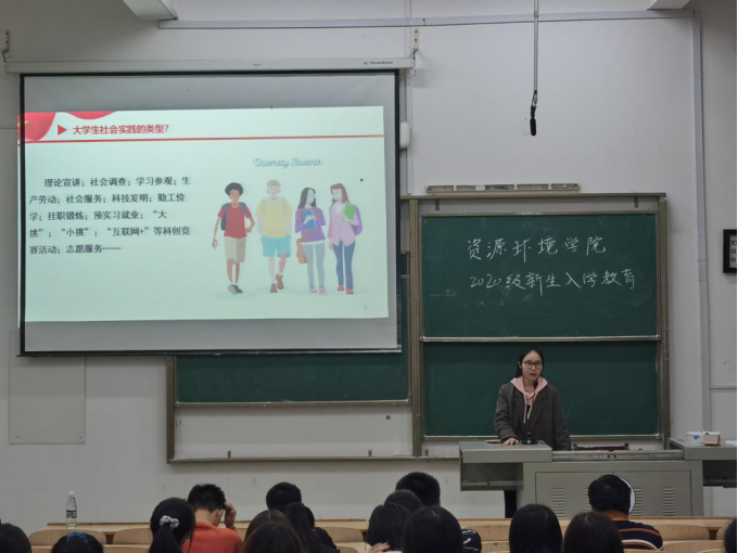 李明老师以《新时代资环学子的历史使命与责任担当——与2020级新生面对面》为题,从新时代“五位一体”总体布局出发,强调了生态文明建设上升为国家战略;从习近平总书记“绿水青山就是金山银山”的生态文明观出发,期望加深同学们对环境和经济的辩证认识;最后向同学们介绍了党的十九大对生态文明建设的蓝图描绘,号召大家从细微之处做起,坚持绿色价值取向、树立绿色思维方式、倡导绿色生活方式,细节之中践行绿色发展理念,共同撑起新时代生态文明建设的一片蓝天。