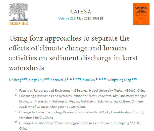 近日,公司研究生程思在中科院一区Top期刊《Catena》发表题为“Using four approaches to separate the effects of climate change and human activities on sediment discharge in karst watersheds”的科研论文。该研究应用四种方法定量评估了我国西南地区典型喀斯特流域气候变化和人类活动对泥沙变化的影响。