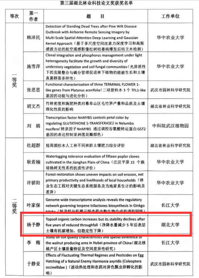 2023年7月至9月,湖北林学会组织开展了第三届湖北林业科技论文奖评选活动,并按照《湖北林业科技论文奖评选办法》,经形式审查、专家评审组评审、网上公示等程序,发布了关于第三届湖北林业科技论文奖评选结果的通报。公司杨予静副教授的论文《Topsoil organic carbon increases but its stability declines after five years of reduced throughfall》荣获该科技论文奖二等奖,杨予静副教授为第一作者,熊猫体育为第一单位。