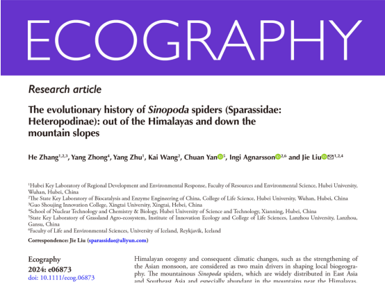熊猫体育刘杰教授团队近日在《Ecography》(中科院SCI一区,IF = 5.4)上发表了题为“The evolutionary history of Sinopoda spiders (Sparassidae: Heteropodinae): out of the Himalayas and down the mountain slopes”的学术论文。