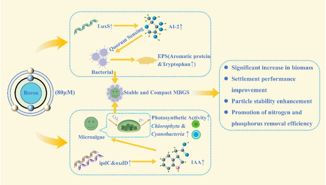 微藻-细菌颗粒污泥(MBGS)是一种高效、节能且环境友好的污水处理技术,能够通过微藻和细菌的协同作用实现污染物去除和资源化利用。然而,藻类与细菌之间的相互关系易受环境变化影响,导致系统稳定性下降。本研究聚焦硼元素在MBGS系统中的作用,发现硼通过促进细菌自诱导因子(AI-2)的分泌,激活群体感应(QS),显著提高细胞外聚合物(EPS)的生成量,增强了颗粒污泥的结构稳定性和沉降性能。同时,硼调控藻类吲哚-3-乙酸(IAA)的水平,提高光合作用效率,使绿藻门和蓝藻门的丰度显著增加,从而优化了氮、磷等污染物的去除效率。在最优硼浓度(80 µM)下,MBGS系统表现出最佳性能,包括显著提高的氨氮(NH4+-N)和磷酸盐(PO43--P)去除效率,以及降低的氧化应激水平(以超氧化物歧化酶(SOD)活性减少为标志)。硼通过调控藻类与细菌的信号通信,强化了它们的协同作用,为提升MBGS技术在污水处理中的稳定性和效率提供了理论依据。这一研究结果展现了MBGS技术在实现碳中和与资源回收方面的巨大潜力。本论文熊猫体育为第一完成单位,2021级硕士生万仁辉和2023级硕士生莫凡为共同第一作者,熊猫体育胡惠秩副教授为论文通讯作者。该项研究得到湖北省自然科学基金的支持。