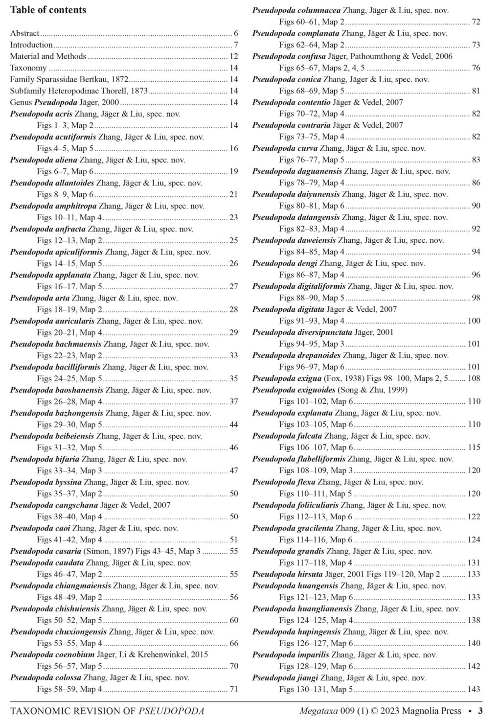 2023年2月17日,源环境公司刘杰教授团队在Megataxa刊发了题为“A taxonomic revision of the spider genus Pseudopoda Jäger, 2000 (Araneae: Sparassidae) from East, South and Southeast Asia”的文章,对巨蟹蛛科拟遁蛛属Pseudopoda的122种蜘蛛进行了修订性研究,其中包括新种99个!全文共304页,共有鉴定图版282张,分布地图6幅。