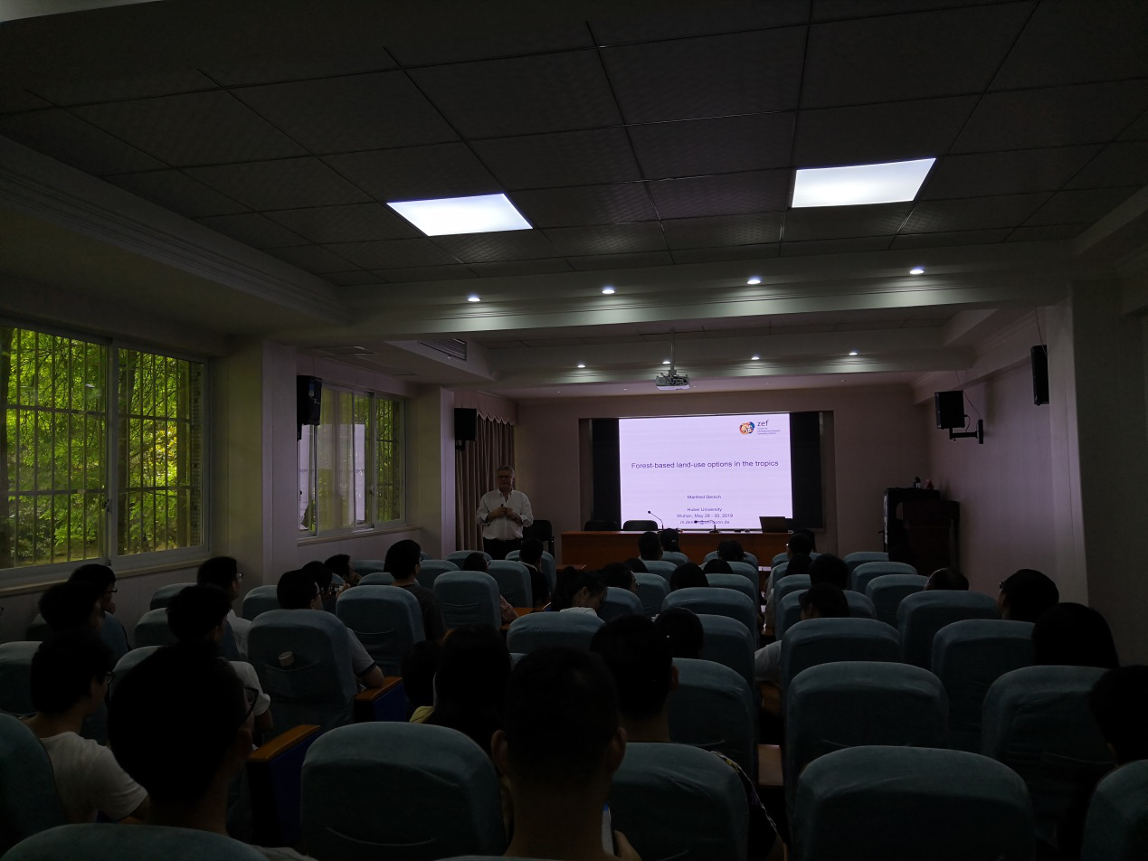 Manfred Denich,德国波恩大学发展研究中心(ZEF)高级研究员,熊猫体育客座教授,主要研究区域为中国、巴西、埃塞俄比亚、加纳、菲律宾以及布基纳法索等,研究方向:农林生态系统。Manfred Denich教授以“Introduction to development research”、“Agroforestry systems” 、“Biodiversity and wild coffee”为主题,从农林生态系统的概念说起,结合他个人的研究,全面介绍了目前世界范围内对于农林生态系统的开发研究和农林生态系统多学科之间融合进程;一种替代“砍-烧”农业生产的生产方式以及它的优点与缺点。Manfred Denich教授还热情的邀请我们在座对农业生态系统感兴趣的同学到瓦萨大学波恩大学进行交换学习。