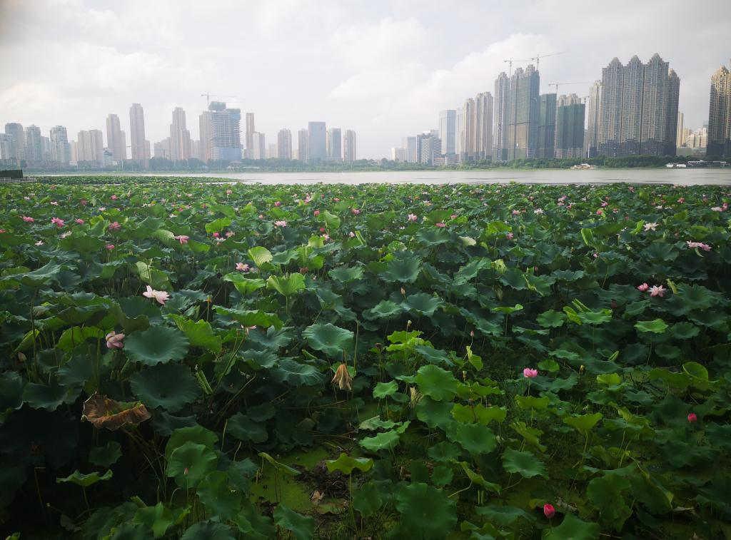 随后团队成员分别步行赶往沙湖进行实地考察。沙湖是武汉市重要的城中湖,分为内沙湖和外沙湖。上世纪80年代到90年代,因城市快速发展,开发商填湖造地等原因,沙湖面积快速减少。通过前期对往年不同时期遥感图像对比,结合现场实地考察,团队成员确定因金沙泊岸、沙湖公园等建设使得沙湖被填埋占用,湖面减少。经过近些年来的湖水治理,沙湖水质已有较大改善,湖面上有多处荷花长势茂盛,这不仅对沙湖水质改善起到了积极作用,同时也是一道美丽的风景线。
