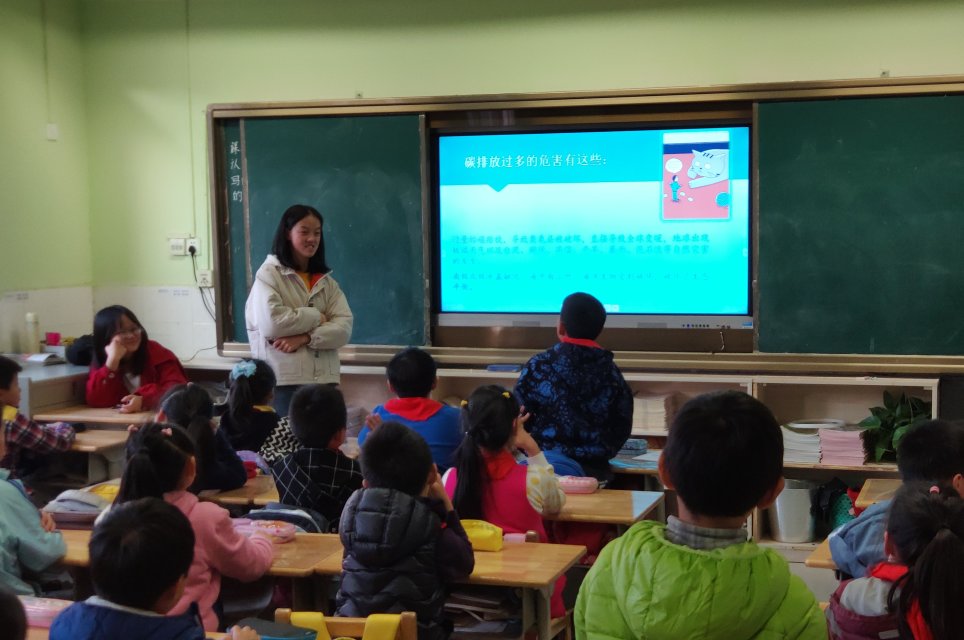 志愿者们首先带领小朋友们进入游戏环节。他们先将小朋友们分组,并给每个组分发印有不同交通工具的卡片,让他们比较每种工具的碳排放量。当志愿者们问起哪种交通工具最环保时,小朋友们异口同声地说出了“自行车”这个选项。游戏环节结束后,主讲人为小朋友们讲解幻灯片,借此向孩子们补充碳排放的有关知识,随后便让他们自由发言在生活中如何做到低碳。下午5点,活动接近尾声,志愿者们给小朋友们分发了环保帆布袋并与他们合影留念,此次志愿活动在孩子们的笑语和掌声中圆满结束。