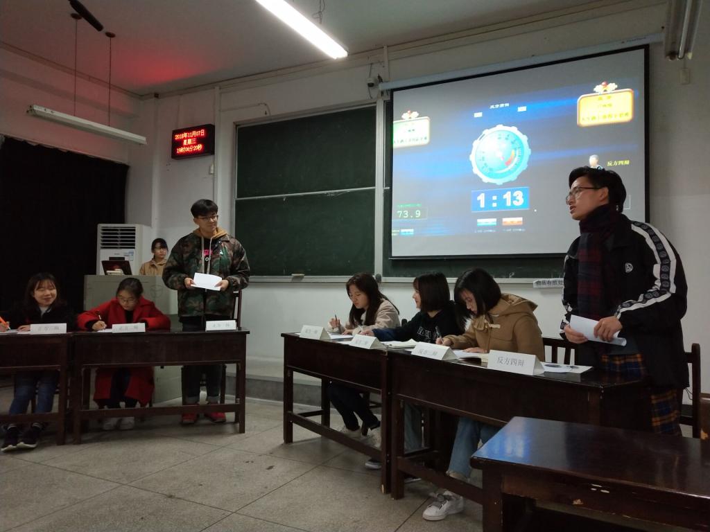 2018年11月7日晚,熊猫体育新生杯辩论赛决赛在教三208教室成功举行。经过激烈的争逐,正方17级城规队取得了胜利,反方17级地信队的四辩被评为最佳辩手。