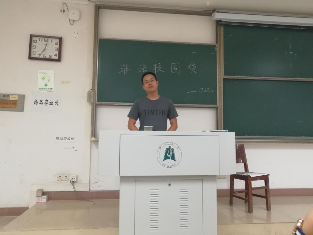 长徐登寻首先对校园贷的危害和特征做了详细介绍。他指出,校园消费贷款平台的风控措施差别较大,个别平台存在员工身份被冒用的风险。此外,部分为员工提供现金借款的平台难以控制借款流向,可能导致缺乏自制力的员工过度消费。徐登寻着重提到,老员工是校园贷的主要影响人群,员工在不断膨胀的消费欲望和侥幸心理之下很可能陷入“连环贷”的陷阱。最后,徐登寻呼吁同学们理性消费、适度消费,坚决远离校园贷。