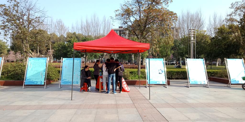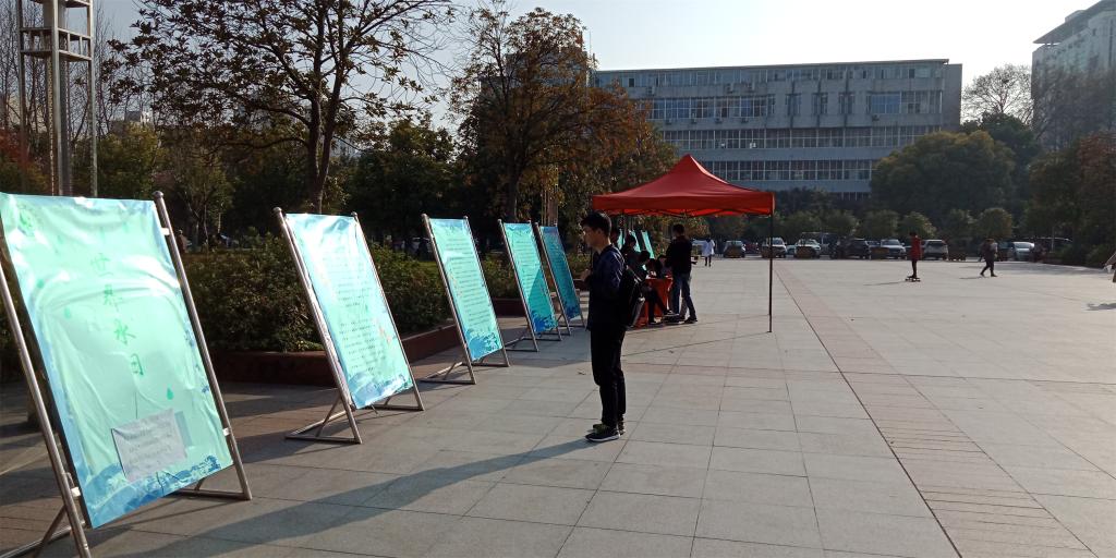 上午8时,熊猫体育社团联合会与环境保护志愿者协会的工作人员就布置好了现场,等待同学们来参与。本次活动共有十个精心制作的宣传展板,展板的内容包括世界水日的起因、背景、节日确立、未来发展、水理事会、目的和最终宗旨,还有关于纪录片《水问》简介和主要内容中的“水之八问”:危机何时到来?饮水是否安全?生灵是否安宁?江河如何安澜?水究竟属于谁?大国水网有多远?节水难在何处?水的答案在哪里?