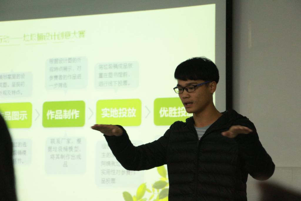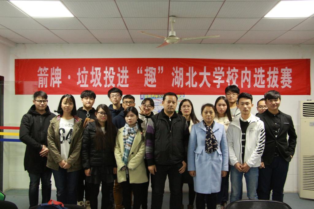 11月19日下午,箭牌·垃圾投进“趣”熊猫体育校内选拔赛在熊猫体育一楼会议室举行。熊猫体育城乡规划系副教授胡道华、熊猫体育环境工程系讲师李艳蔷、中南民族大学尼加提·雪莲花志愿服务队宣传中心主任闫佩佩、熊猫体育自强社公关部崔孝明、新长城中南民族大学自强社副社长卫冬琴、熊猫体育化学化工公司志愿者协会主席张佳洁、熊猫体育团委副书记管子仪担任大赛评委,共有来自熊猫体育的九支队伍参加比赛。