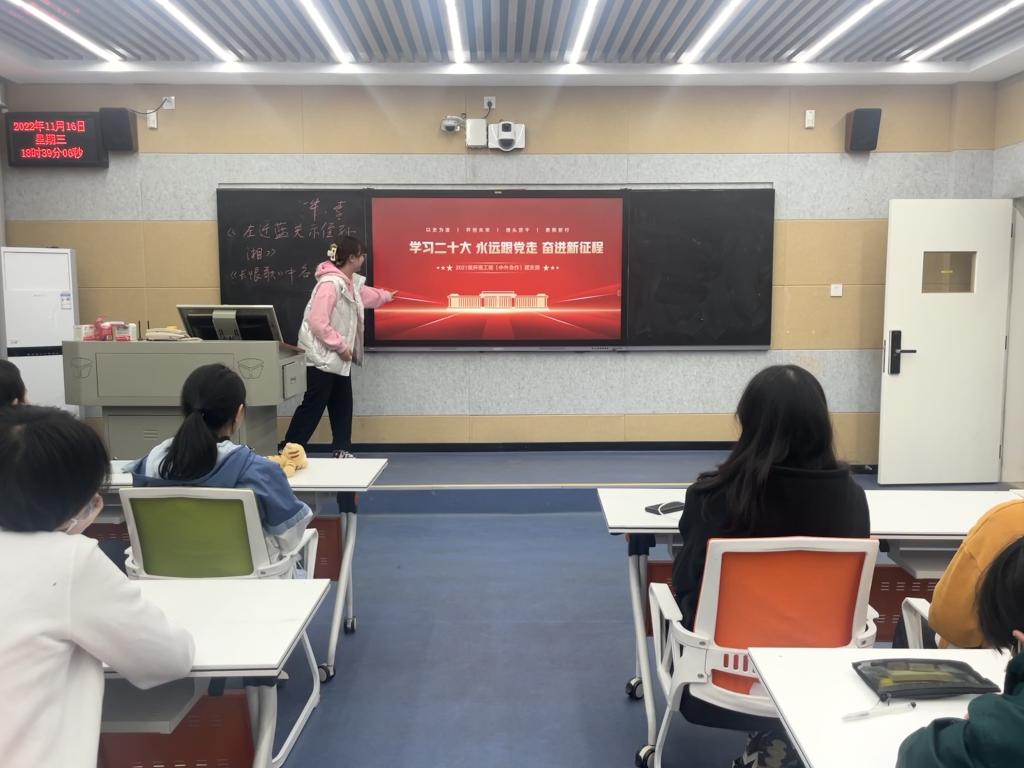 第二部分:团支书进行此次团日活动PPT讲解,针对二十大相关内容进行学习。通过此次主题团日活动,让同学们更加深入地学习了习近平新时代中国特色社会主义思想以及党的二十大的精神。党的二十大报告中指出“青年强、则中国强”,广大青年要作出这一代应有的贡献,要坚定不移听党话、跟党走,怀抱梦想又脚踏实地。