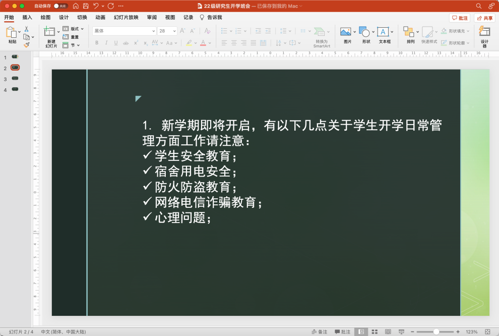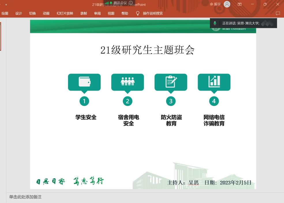三位老师主要向同学们强调宿舍安全教育、防火防盗教育、网络电信诈骗教育、心理健康教育等方面,着重关心员工身体健康,提醒员工做好健康监测,不要带病进行实验和实习。并宣讲因新冠患病等原因导致经济困难的员工,可申请临时困难补助的政策。