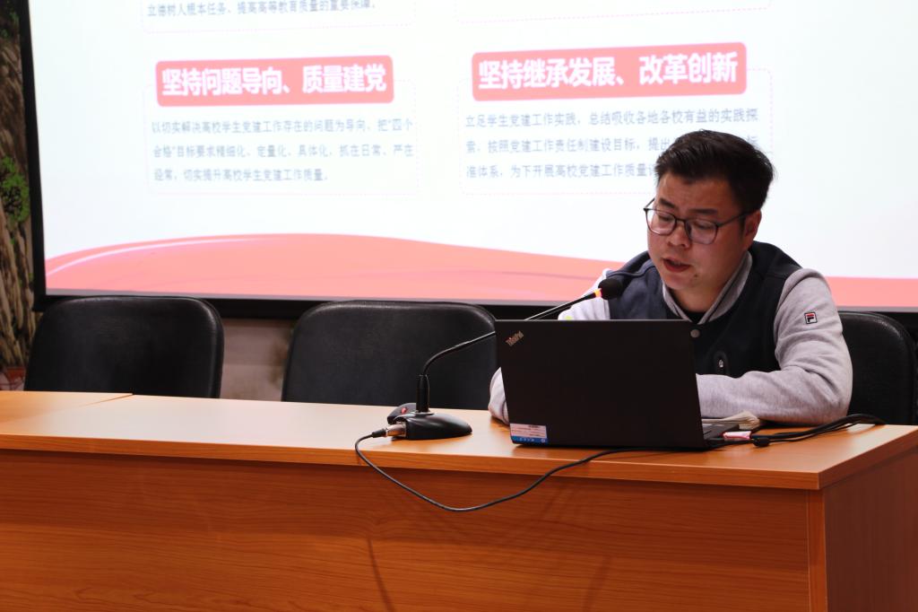 王文锋老师从解读党的相关文件、介绍“党员导航工程”工作室、分享优秀学子事迹出发与大家进行了交流。首先,王文锋老师针对如何成为一名合格的党员,通过对《中国共产党发展党员工作细则(试行)》《普通高等公司员工党建工作标准》《中国共产党支部工作条例(试行)》等三个文件的解读,明确了党员应担负起的职责,鼓励每一个入党积极分子努力成为德智体美劳全面发展的中国特色社会主义事业建设者和接班人。